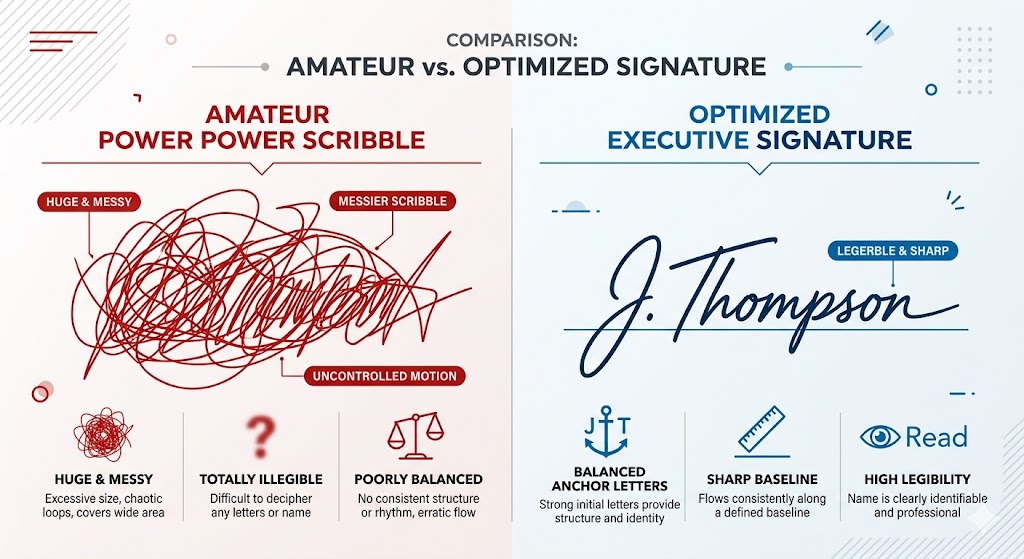 - Myth 1: “Make it totally unreadable to look like a busy executive.” Amateurs believe illegibility projects importance and high status. Our clinical data proves the exact opposite. Complete illegibility in a signature is a subconscious declaration of evasion. It tells the reader: “I do not want to be held accountable for the contents of this document.” If you cannot read the name, the writer is hiding.